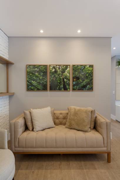 No living, tons claros foram escolhidos para criar uma atmosfera leve e serena. O destaque fica por conta do sofá rosa, um pedido especial da cliente, que imprime delicadeza ao ambiente.