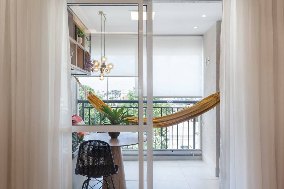 A varanda, projetada como uma extensão da sala de jantar, integra serralheria preta com nichos aéreos e uma rede amarela, resultando em um contraste vibrante e convidativo.