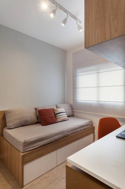 O dormitório de hóspedes foi equipado com soluções inteligentes, como uma cama com gavetas embutidas, que otimiza o espaço sem comprometer a elegância.
