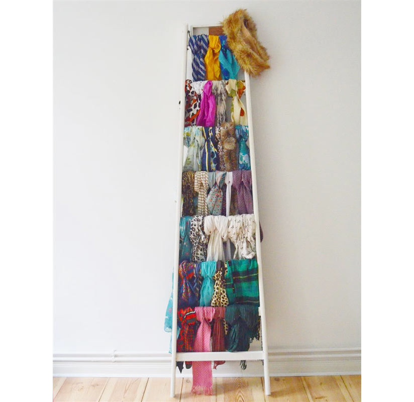 Encontrada no sótão da casa dos pais da blogueira alemã Kati, com uma boa lixada, pintura e verniz, o que antes era entulho se tornou parte da decoração. O display facilita a visualização dos lenços (echarpes e cachecóis também funcionam) e ainda traz cor para o quarto. É muito mais bonito e prático colocar as roupas assim do que dobradas e escondidas dentro do armário!