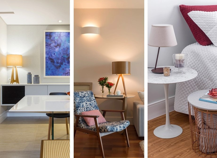 Além de oferecer um ponto extra de iluminação, o objeto complementa a decoração com aconchego e por isso está sempre presente nas áreas intimas. “Ele é perfeito para apoiar aquela leitura ou o momento gostoso de uma conversa antes de dormir. É o par ideal das mesas de cabeceira”, destaca Carina.
