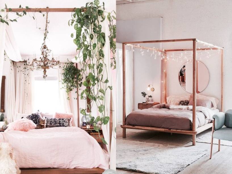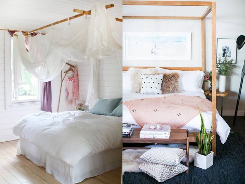 As camas com dossel possuem uma estrutura de ligação alta. As vigas conectam quatro postes, um em cada canto. Para obter privacidade e calor, você pode colocar um tecido sobre a estrutura. Outra opção é usar plantas e luzes para um ambiente mais estiloso e que exalte a sua personalidade.