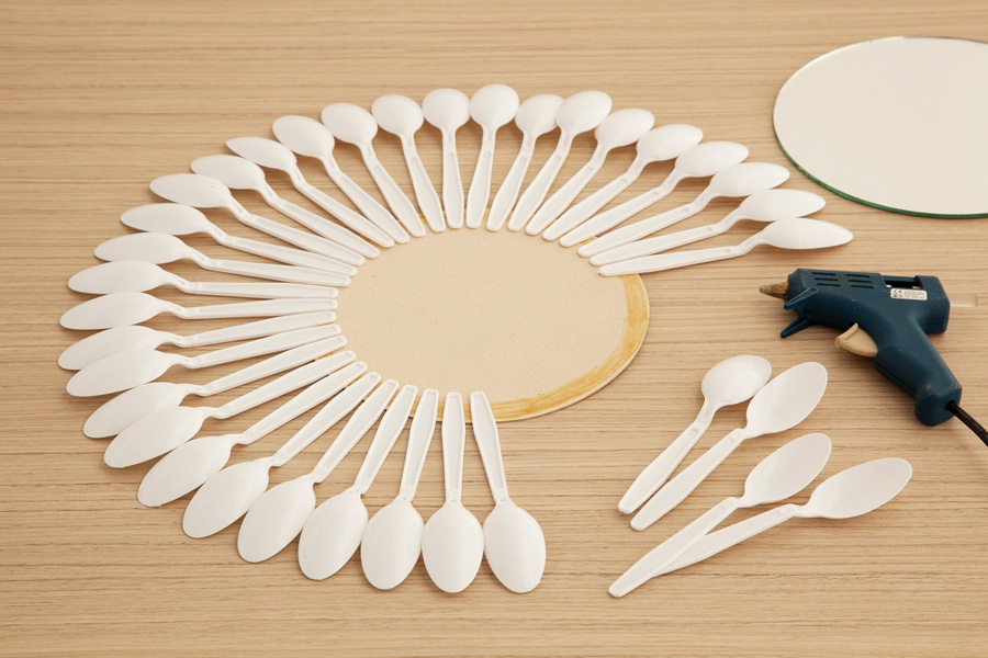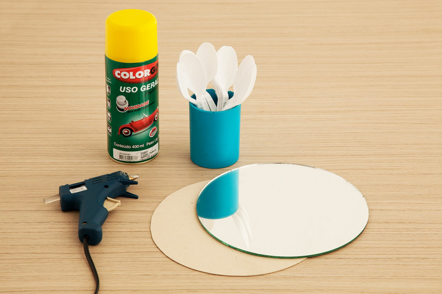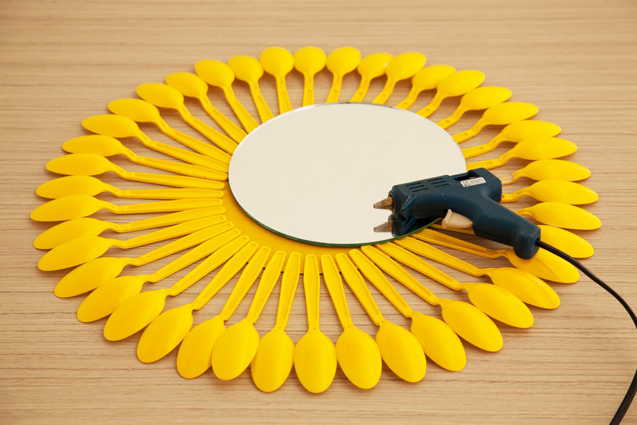 Um espelho que tem uma moldura de colheres de plástico. É inusitado e fica lindo na parede. Na foto, usamos um espelho redondo. O primeiro passo é recortar um circulo do tamanho do espelho no papel Paraná (um tipo de papelão). Use o espelho como molde. Grude as colheres de plástico nesse papelão com uma cola quente. Como as colheres de plástico são geralmente brancas, foi usado um spray automotivo amarelo para deixar a moldura mais divertido e impactante. Depois de pintar, é só deixar secar e fixar o espelho com uma fita dupla face na parede. Quem colocou a mão na massa para criar esta moldura foi a Cris Guimarães. Os móveis são da Via Vila, a cadeira é da Tok & Stok e os pratos são da Etna.