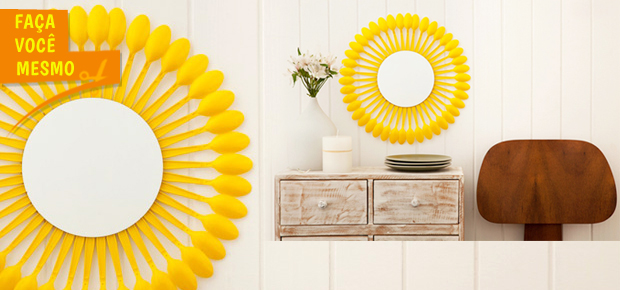 Um espelho que tem uma moldura de colheres de plástico. É inusitado e fica lindo na parede. Na foto, usamos um espelho redondo. O primeiro passo é recortar um circulo do tamanho do espelho no papel Paraná (um tipo de papelão). Use o espelho como molde. Grude as colheres de plástico nesse papelão com uma cola quente. Como as colheres de plástico são geralmente brancas, foi usado um spray automotivo amarelo para deixar a moldura mais divertido e impactante. Depois de pintar, é só deixar secar e fixar o espelho com uma fita dupla face na parede. Quem colocou a mão na massa para criar esta moldura foi a Cris Guimarães. Os móveis são da Via Vila, a cadeira é da Tok & Stok e os pratos são da Etna.